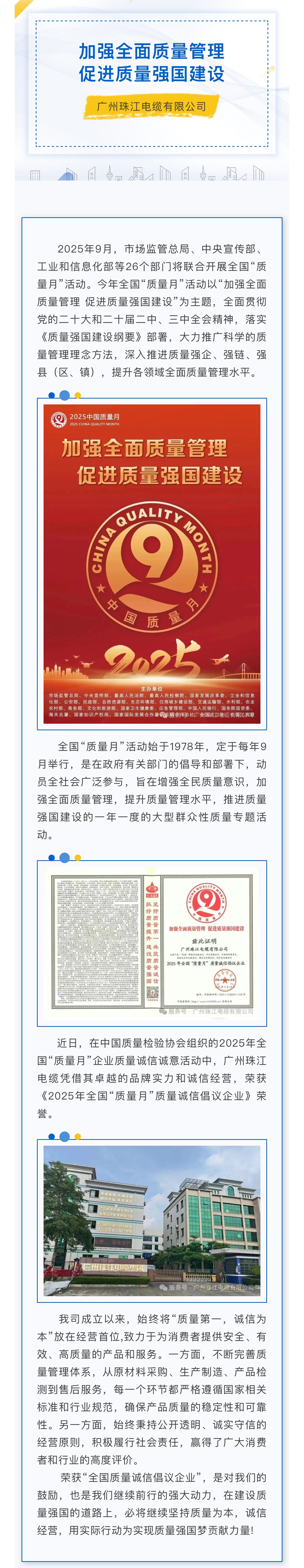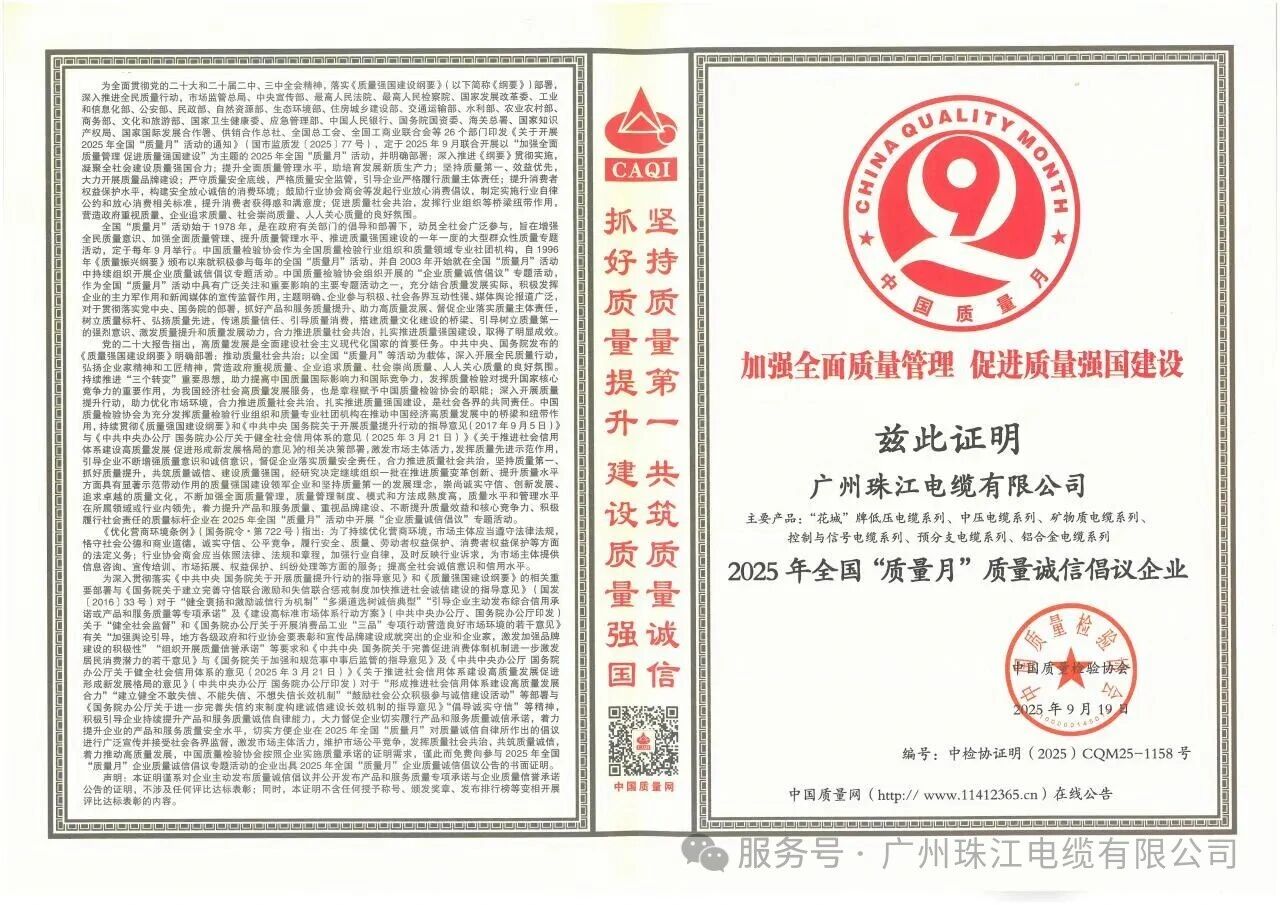 “湾区制造”获评企业——广州珠江电缆荣获2025年全国“质量月”质量诚信倡议企业!