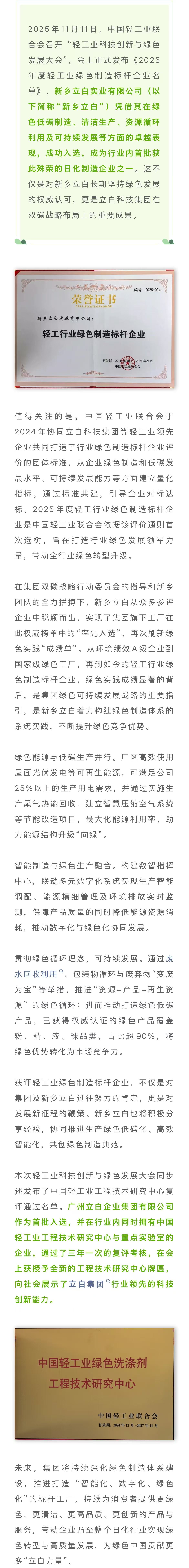 【会长风采】“湾区制造”获评企业——新乡立白成功获评2025年轻工行业绿色制造标杆企业