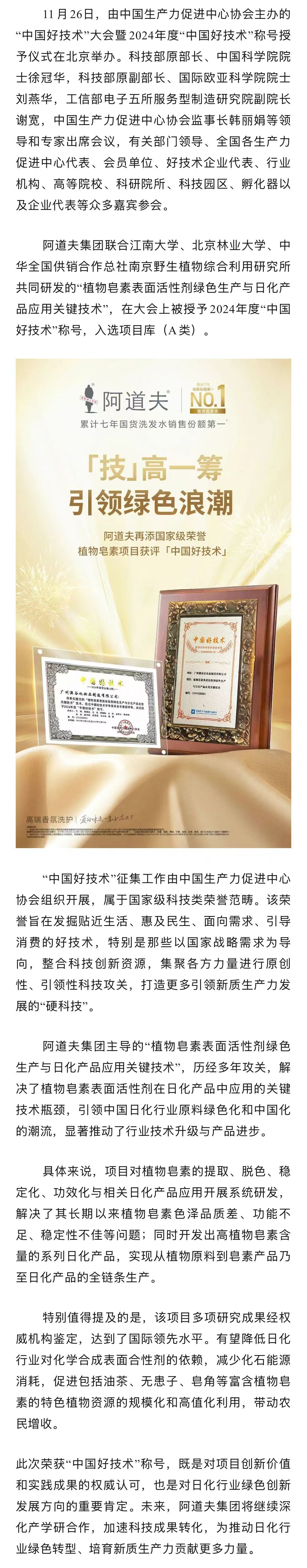 【副会长风采】“湾区制造”获评企业——阿道夫集团植物皂素项目获评“中国好技术”, 引领行业绿色革新!